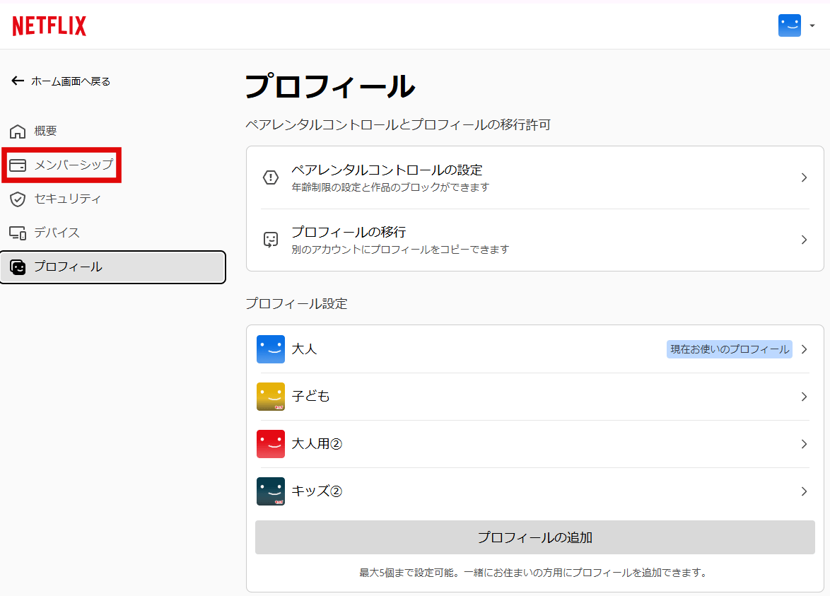 右上のアイコンから「アカウント」をクリック後、下の画像の赤枠内の「メンバーシップ」をクリックします。