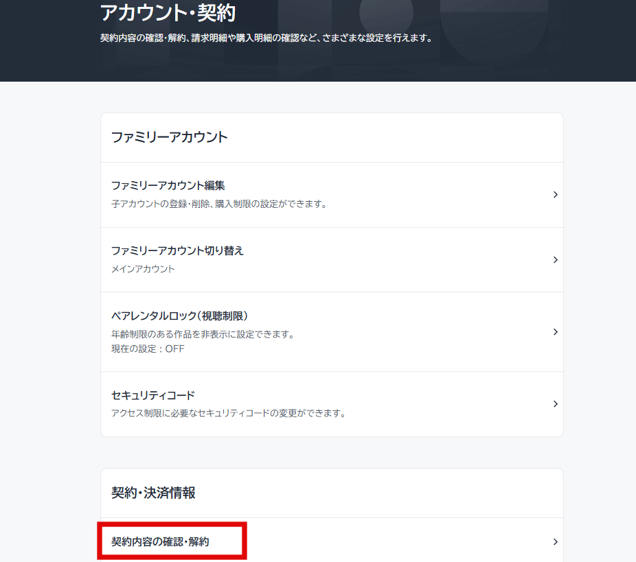 トップページの左側「アカウント・契約」をクリック後、以下画像の赤枠内「契約内容の確認・解約」をクリックすると、解約画面へ進めます。