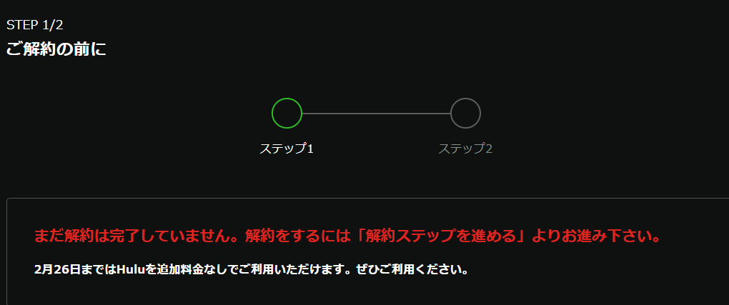 1回目の「解約する」は、解約手続きのスタートになるので、以下の画像のように、次の画面で「解約ステップを進める」をクリックします。